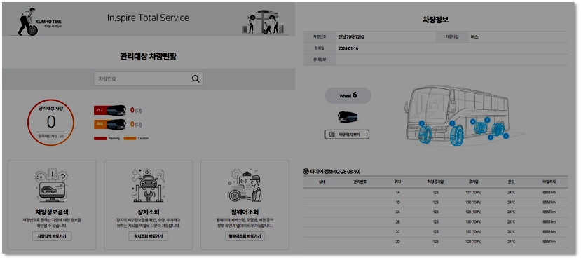타이어 정보, 차량 정보, 운행 정보, 자재 관리를 쉽게 이용 가능